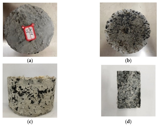 Before grouting, the specimen is 63 mm in height and 101.6 mm in diameter, with a connected void ratio of 23.0% and a mass of 961 g. The test results show that the effect of adding the modifier ratio on the density of the grout can be negligible. Thus, the density of the grout is 1.84 g/cm3, and the theoretical grouting volume Q of the Marshall specimen is 217.97 g according to Equation (3). The main reason is the loss of cement-based grouting material during grouting. To ensure the grouting effect and to control the difference in grouting results caused by the amount of grouting material to the maximum extent, the actual grouting volume is selected as 250 g.