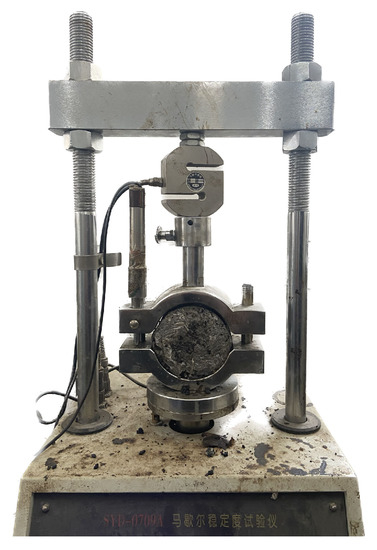 As one of the early design criteria for asphalt pavement, Marshall stability (MS) can reflect the deformation resistance of asphalt mixtures to some extent. To determine the effect of different modifiers on the mechanical properties of semi-flexible pavement mixtures, the ASTM D6927-15 MS test (shown in Figure 6) was used to measure the mechanical properties of semi-flexible pavement mixtures mixed with different modifiers by measuring the MS evaluation.