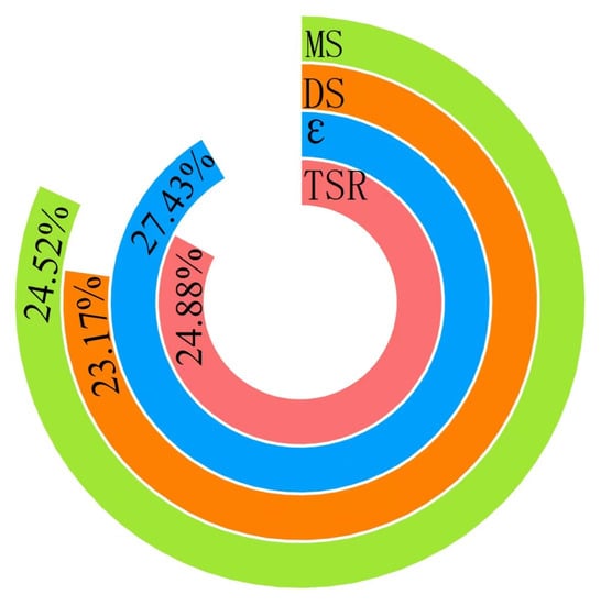 The information contributions () of the two principal components and the cumulative contribution rate were calculated with Equations (14)–(16). Thus, the two principal components extracted from the original data were converted into a single indicator, i.e., the composite score, through the contribution rate. The specific results are shown in Table 22.