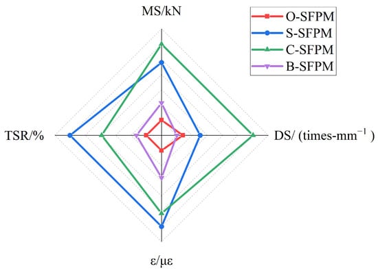 The water–cement ratio was finally determined to be 0.5 by changing it and taking the properties of grout flow, flexural strength, and compressive strength as the evaluation indicator. The specific ratios of ordinary SFPM (O-SFPM), silane coupling agent—SFPM (S-SFPM), cationic emulsified asphalt—SFPM (C-SFPM), and butadiene latex—SFPM (B-SFPM) are shown in Table 8.