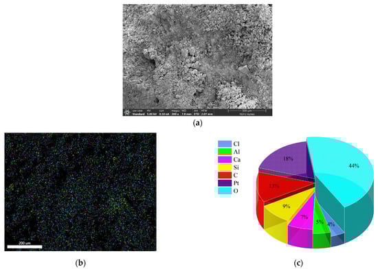 Figure 14b shows the element states of the cationic emulsified asphalt-cement-based grouting material obtained by energy spectra analysis. Although cement does not contain carbon, asphalt contains a large number of carbon elements. However, due to objective factors such as sample preparation, SEM observation is highly susceptible to carbon contamination. Thus, Cl was selected as the characteristic element to express the insoluble complex salt-hydrated calcium chloroaluminate mentioned above and CaCl2. Figure 14d shows the distribution of Cl. As can be observed, Cl is evenly distributed in the cementitious material, indicating that the insoluble compound salt-hydrated calcium chloroaluminate is evenly distributed in the cementitious material as its reaction mechanism connects the inorganic and organic materials. It played a certain reactive linkage role and finally formed a kind of inorganic–organic composite structure product in which cement, cement hydration product, and asphalt film penetrated each other, thus improving the strength of cementitious grouting materials. Thus, the performance of SFPMs was improved.