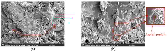 Figure 16a,b show the microscopic morphology of ordinary cement-based grouting material and cationic emulsified asphalt-cement-based grouting material with 20,000 times magnification. It can be observed from Figure 16b that the smooth part is the asphalt film formed after the emulsification of emulsified asphalt, and the porous structure is the cement and cement hydration products. Some regular spherical asphalt particles are deformed and attached to the cement hydration products and asphalt film.