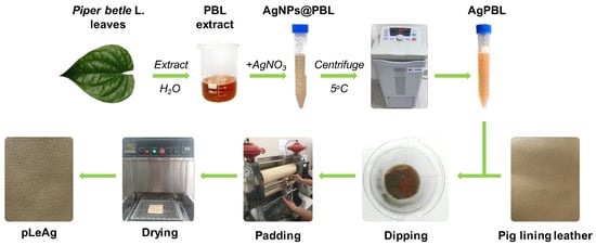 In the next step, the pig lining leather samples were treated with the bio-synthesized AgPBL solutions using the padding method. The leather samples were dipped in AgPBL solutions with various concentrations (160, 80, 40 and 20 μg/mL) for 30 min at a liquor-to-leather ratio of 5:1 (w/w). The wet pickups were set at 70%, 80% and 90%, and the padded samples were then dried at 105 ± 3 °C for 3 min using SDL mini-drier 398 laboratory thermo-fixation (SDL Atlas China, Shenzhen, China). The dipping–padding–drying processes of the leather samples were repeated two times. All processed leather samples were conditioned at 65% RH and 25 °C in a Mesdan M250-RH (Mesdan SpA, Brescia, Italy) conditioning chamber for 24 h before storage in plastic bags for microbiological analysis. The processes of synthesizing AgPBL and applying it onto pig lining leather are depicted in Figure 1.