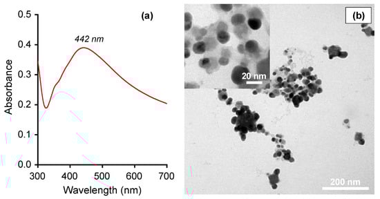 In previous research, we optimized the conditions for the bio-synthesis of silver nanoparticles from PBL leaf extract and evaluated their antibacterial activities against three bacterial strains, including E. coli, P. aeruginosa and S. aureus []. In the current work, we re-fabricated AgPBL under the optimized conditions and characterized its properties using UV-vis, TEM and antifungal activity analyses. The UV-Vis spectrum in Figure 2a indicated a maximum absorption peak at 442 nm due to the surface plasmon resonance (SPR) of spherical silver nanoparticles [,,]. The TEM image in Figure 2b confirmed well-dispersed, spherical-shaped nanoparticles with a fairly uniform size of about 20 nm. The well-dispersion of AgPBL was attributed to the bio-constituents in the PBL extract, which effectively prevented nanoparticle agglomeration and stabilized them.