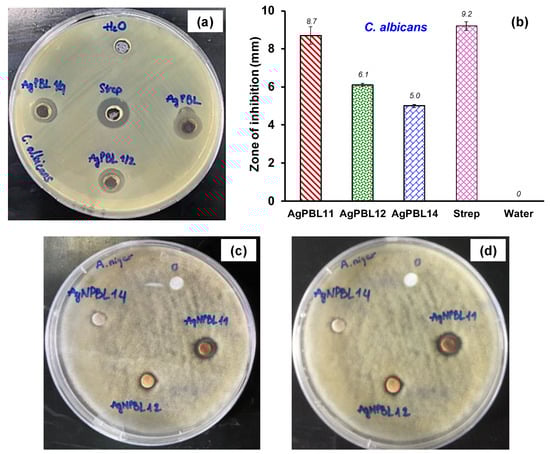 To assess the antifungal activity of the AgPBL, one mold strain (A. niger) and one yeast strain (C. albicans) were exposed to various AgPBL concentrations (100, 50 and 25 μg/mL) via the plate diffusion method. As shown in Figure 3a–d, the double distilled water (a negative control) exhibited no antifungal activity in terms of inhibition zone, while the AgPBL and the Streptomycin (Strep) obviously revealed ZOI. It was evident that AgPBL showed promising antifungal activity against both tested fungi. A comparison of the ZOI size for each fungal strain indicated a tendency for decreased antifungal action with decreasing AgPBL concentration, although this tendency was not proportional to the change in AgPBL concentration. For instance, reducing the AgPBL concentration by 50% and 75% resulted in a ZOI reduction for C. albicans of 29.9% and 42.5%, respectively. The results observed from Figure 3c,d after 7 and 14 days of the antifungal tests against A. niger revealed clearly that mold spores could not grow on the AgPBL-impregnated paper disks at any concentration. However, the paper disk impregnated with 25 μg/mL AgPBL solution did not exhibit a clear inhibition zone, indicating that the antifungal activity of AgPBL against C. albicans was better than against A. niger. The antifungal properties exhibited by bio-synthesized AgNPs were consistent with the findings of previous studies [,].
