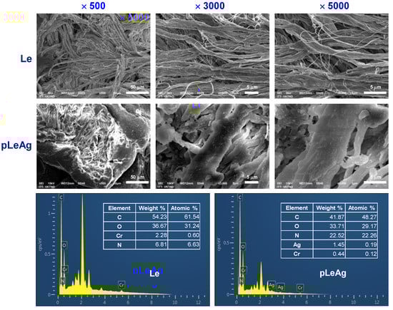 The SEM micrographs at different magnifications of ×500, ×3000 and ×5000, and EDX spectra of the blank leather (Le) and the AgPBL-modified leather sample (pLeAg).