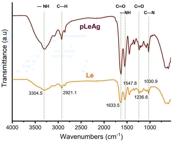 In order to determine the possible interaction between AgPBL and the functional groups of collagen proteins on the modified leather, the FTIR analyses of Le and pLeAg samples were carried out, and the spectra were given in Figure 5. The characteristic peaks corresponding to the functional groups of the collagen proteins in the Le sample at 3304.5, 2921.1, 2852.3, 1633.5, 1547.8, 1236.6 and 1030.9 cm−1 were assigned to –NH, –CH3, =CH2, –C=O, –NH, –C=O (in amide III) and C–N (in amine) groups, respectively [,,]. Compared to the blank leather, the pLeAg spectrum exhibited similarity in their characteristic peaks, except for the stronger peak intensities, suggesting the chemical structure of the leather was mostly unchanged. The collagen proteins of leather contain polar groups on the side chains of their constituent amino acid residues, and as such, the amide and carboxylate functional groups of these residues have a tendency to bind with metal atoms [,]. Thus, AgPBL could be absorbed onto the leather surface through the electrostatic interaction of Ag+ ions with the negative charge of RCOO− or lone-pair electrons of N atoms of amino acids. In addition, the formation of hydrogen bonding between the amide and carboxylate groups of the collagen proteins with the appropriate functional groups of the organic layer existing on the AgPBL surface also contributes to these binding interactions. The shifted peaks of the functional groups in the modified leather samples could be attributed to the interaction of heavy silver atoms with the amino and amide groups of collagen protein molecules, resulting in an increase in peak intensity []. The results of coloration, SEM, EDX, AAS and FTIR measurements for both blank and modified leather samples were consistent with each other, providing strong evidence for the incorporation of AgPBL into the leather matrix.