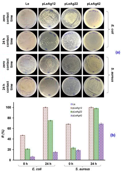 The leather samples treated with various AgPBL concentrations at the wet pickup of 80% were subjected to the quantitative test to determine the bacterial reduction percentage. This test was performed at 0 h and 24 h contact times between the sample and the test bacteria inoculate. As shown in Figure 7a, the Petri dishes for 24 h contact time revealed that both tested bacteria grew well on the Petri dishes of blank leather, indicating that Le did not possess bacterial inhibition. Based on the agar’s turbidity, the pLeAg12 samples showed the highest antibacterial activity, while the pLeAg42 samples exhibited the lowest.