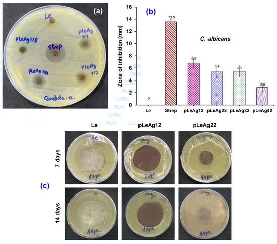 (a) Antifungal activities of the Le, pLeAg and Strep-treated leather samples against C. albicans with change in the AgPBL concentration; (b) Mean zone of inhibition against C. albicans (±SD, n = 3); (c) Antifungal activities of the Le, pLeAg12 and pLeAg22 samples against A. niger after 7 and 14 days of incubation.