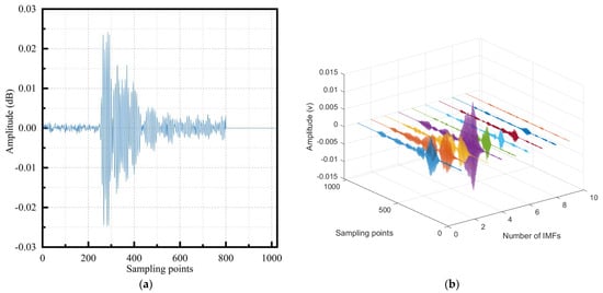 The acoustic emission signal resulting from matrix cracking in the damage exhibited medium-to-low intensity, while the delamination signal in the composite damage was challenging to distinguish and fell within the medium intensity range. On the other hand, the fiber fracture signal was classified as medium-to-high intensity. A tensile test conducted on a single material showed that the matrix cracking signal was distinct and exhibited minimal noise such as mechanical friction. Hence, the matrix cracking signal was chosen for the analysis. Based on this selection, the signal of sample 1 underwent VMD. The time domain and frequency domain plots of the decomposed signal are presented in Figure 8. Observing Figure 8b,d, it became apparent that the original signal after VMD produced nine signal components, and they were represented by different colors. Each component was primarily confined to a different frequency range, indicating a highly effective decomposition outcome.
