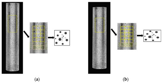 DIC is a non-contact modern experimental optical measurement technology. Based on the correlation principle between images, it can measure the three-dimensional coordinates, displacement and strain of an object’s surface in the process of deformation by tracking the speckle image on the object’s surface []. The basic principle involves comparing an undeformed reference image with a series of deformed images, and dividing the reference image into multiple small squares, called subsets, as shown in Figure 1.