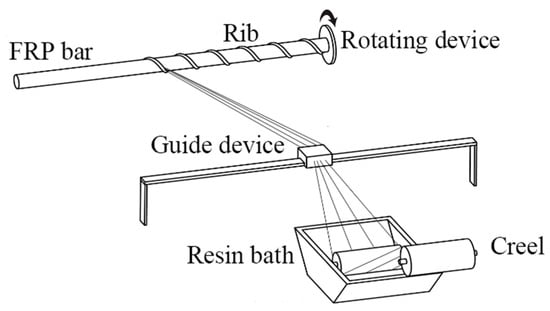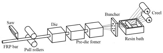 After the pultrusion process to produce GFRP bars with mainly axial fibers, continuous fiber bundles were impregnated with resin; then, they were wound onto the surface of the bars in a set winding direction and at a set angle. In this way, we could produce GFRP ribs with a specific pitch and angle. Finally, the desired ribbed GFRP rods were obtained using a pressure curing device and a cutting device. The production process is shown in Figure 3.