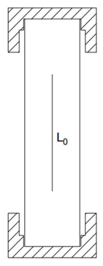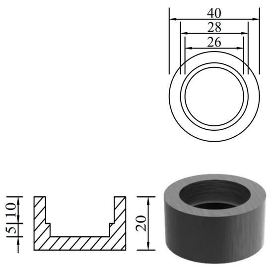 In order to prevent stress concentration at the end of the loading process from affecting the testing effect [], steel caps were used to constrain both ends of the specimen, and epoxy resin was poured into the spare part to fix it. The effective length of the specimen was 100 mm, and the overall size is shown in Figure 4. The size of the steel cap used at both ends of the specimen is shown in Figure 5.