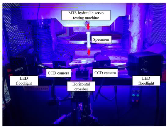 Before the experiment, the CCD camera needed to be calibrated; a calibration plate was placed in the position of the original specimen, and the internal and external parameters of the camera were automatically calculated using the three-dimensional coordinates of the known lattice on the calibration plate and the corresponding image coordinates []. The distance between the camera and the sample, the angle between the two cameras and the position of the illumination source in the 3D DIC system were adjusted, and the camera focus was adjusted to make sure the sample image was clear. The experiment began after the calibration of the system parameters. The system analyzed and compared the speckle images at different times using post-processing software, and was able to obtain the out-of-plane displacement of the specimen surface, that is, the spatial displacement of the specimen surface.
