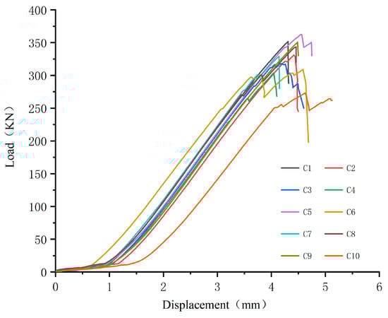 At the beginning of the test loading when the sample is compressed, a slight sound is heard. With the gradual increase in the bearing capacity of the sample, when the compressive stress in the sample is too large, a resin and fiber peeling phenomenon occurs in the place where the bonding between the glass fiber and the matrix resin is relatively weak. With the continuous increase in the load, the peeling area of the fiber and resin continues to increase until it fails. The failure is accompanied by a loud sound, and the load drops sharply, the test load–displacement curve is shown in the Figure 8.