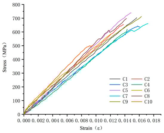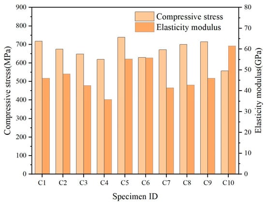 A stress–strain curve of 10 groups of test specimens is shown in Figure 12. It can be seen that the stress–strain of GFRP bars in the compression process is approximately a straight line, and the curves of each specimen gradually separate with the increase in strain and are always at the elastic stage until failure. Brittle failure occurs in all the test specimens. The calculated compressive strength and elastic modulus of 10 groups of test specimens are shown in Figure 13. In order to better observe the dispersion of the experimental results, the average value and standard deviation of each group of data were calculated and are shown in Table 7. This dispersion might be due to manual errors occurring during GFRP production and specimen fabrication, or because the tested specimens might be from different batches of specimens.
