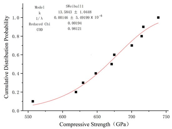 Weibull distribution is correlated with many other distributions, and is determined by two parameters λ and k. The shape parameter k determines the shape characteristics of the curve. When the scale parameter remains unchanged, the PDF function is exponentially distributed when k = 1. When k = 2, it is Rayleigh distribution. In addition, according to relevant studies, shape parameter k is also used as one of the important indicators to evaluate the mechanical properties of materials. The larger the fitted value of k, the better the strength uniformity of materials and the higher the reliability [].