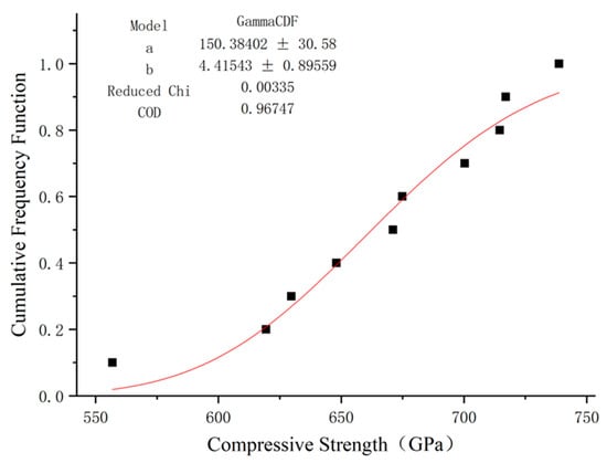 Similarly, a fitting curve that obeys gamma distribution can be obtained. By comparing the fitting results, it can be seen that the determination coefficient R2 of gamma distribution fitting is closer to 1 than Weibull distribution fitting, and the fitting effect is better. Therefore, it is better to use the gamma function when determining the compressive elastic modulus of GFRP bars and the fitting results are shown in Figure 16 and Figure 17.