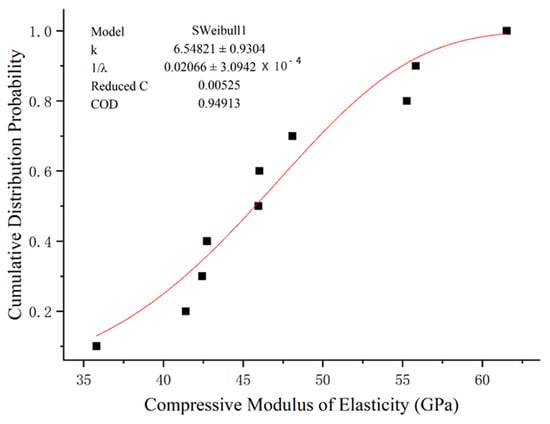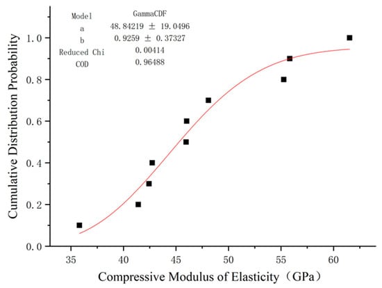 There are limited studies on the use of distribution functions to describe the compressive strength and elastic modulus of GFRP. In addition to Weibull distribution, gamma distribution is often used in engineering to analyze the mechanical properties of fiber composites []. In this paper, these two distributions were used to fit the compression elastic modulus results of GFRP bars, and the fitting results are shown in Figure 14 and Figure 15.