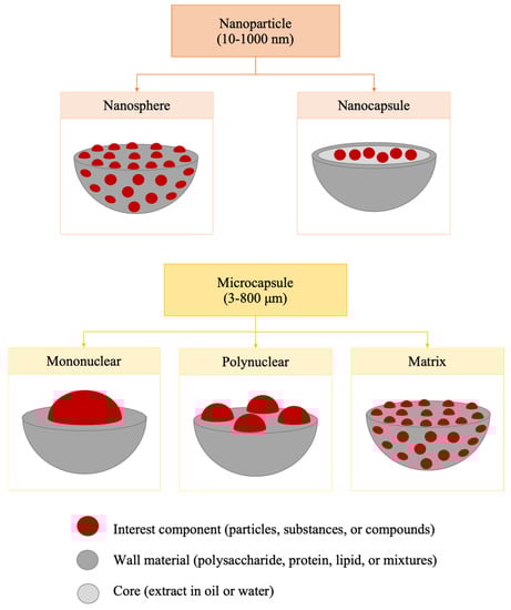 Encapsulation processes can be carried out using hot techniques (e.g., solvent evaporation, spray-drying, and melt extrusion) or cold techniques (e.g., spray-chilling and freeze-drying), with spray-drying being the most widely used technique at the industrial level [6]. Depending on the technique, nanoparticles (capsules or spheres) ranging from 10 to 1000 nm or microcapsules (mononuclear, multinuclear, or matrix) from 3 to 800 µm can be generated [7,8], as depicted in Figure 1.