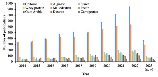 Number of publications related to encapsulation processes using various wall materials (source: Scopus; keywords: encapsulation, chitosan, alginate, starch, whey protein, maltodextrin, pectin, gum Arabic, dextran, and carrageenan; accessed: 23 May 2023).
