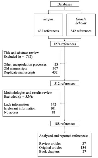 The bibliographic search was conducted from 6 November 2021, to 23 May 2023, using the Scopus and Google Scholar databases. The search focused on the following keywords: encapsulation, spray-drying, chitosan, whey protein, gum Arabic, alginate, maltodextrin, dextran, starch, pectin, and carrageenan. Three types of documents were sought: book chapters, review articles, and original research articles. Book chapters and review articles were selected if the title contained the word “encapsulation”, regardless of the publication year. Original research articles had to meet two criteria: (1) being published between 2017 and 2023, and (2) mentioning spray-drying of bioactive compounds in the title or abstract. The selected information was then used to gather introductory information, definitions, contextualization, and a general overview from the review articles and book chapters. For the discussion, the information was synthesized from the methodologies and most relevant findings of the original research articles. Figure 3 summarizes the search strategy and the inclusion/exclusion criteria of the bibliographic search. The selected information was synthesized into images and tables for analysis and discussion in the subsequent sections.