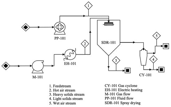 Among the various encapsulation processes, techniques such as spray-drying, spray bed drying, fluid bed coating, and spray-cooling are employed, each with its own mode of operation, although they share the common goal of producing dry particles [11]. Spray-drying, in particular, is a unit process that converts a liquid dispersion into dry particles (<40 µm) and is considered one of the oldest and most widely used encapsulation techniques. It is renowned for its simplicity, user-friendliness, speed, continuous operation, and cost-effectiveness [2,12]. It is estimated that approximately 90% of encapsulated products, including ingredients and additives, are manufactured using this process [12].
