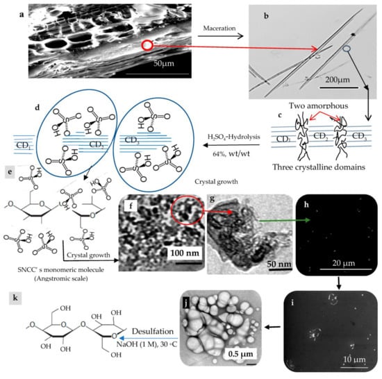 Formation of sulphated nanocrystalline cellulose (SNCCs): (a) SEM micrograph of anatomical structure of a typical wood tissue. (b) An optical image of macerated fibers. (c) The crystalline and amorphous domains within a microfibril. (d) SNCCs crystallite grafted by sulphated groups. (e) A monomeric molecule of SNCC. (f) TEM micrographs of SNCCs colony, and (g) Close-up image the SNCCs colony. (h) SEM micrographs of spreading and converging of the SCMCs. (i) A single colony with wider particles due to agglomeration. (j) SCMCs aggregation of single and multiball-shaped microcrystalline cellulose (SMCCs). (k) Desulphated cellobiose unit.