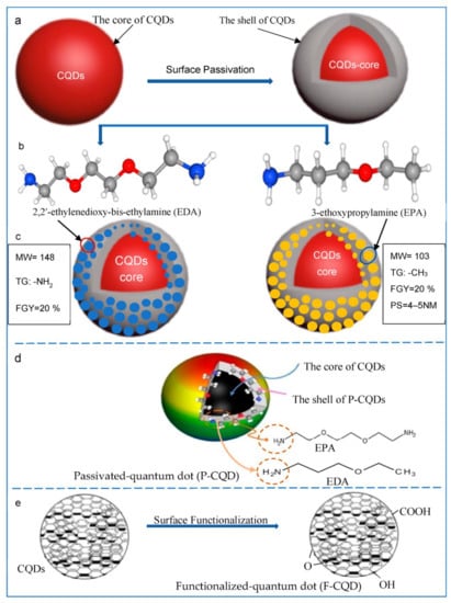The difference between the functionalization and passivation processes of a CQD to produce P-CQDs is shown in Figure 2. For the passivation process, two different P-CQDs can be synthesized, namely EDA-CQDs using 2,2′-ethylenedioxy-bis-ethylamine [15,29], and EPA-CQDs using 3-ethoxypropylamine, as presented in Figure 2b–d [15,29,32,33]. Furthermore, the surface functionalization of CQDs can be achieved by gifting chemical groups such as carboxyl, hydroxyl, oxygen atom, etc., to the CQDs’ surface (Figure 2e).