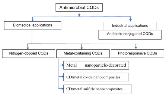 Scheme illustrating the different types of antimicrobial CQDs for biomedical and industrial applications.