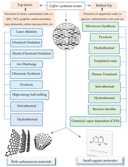 For the synthesis of the CQDs, their precursor differs according to the synthesis route (Figure 4), either a top-down [25] or bottom-up route [81], and whether natural materials (Tables S1 and S2), especially nanocelluloses (MCC and NCC), are used, as shown in Table S2, or synthetic based precursors (Table S3). As shown in Figure 4, the ‘top-down’ synthetic route breaks down larger carbon assemblies such as graphite, carbon nanotubes, nano-diamonds, or carbon nano-powders [25] into CQDs below 10 nm. On the other hand, the ‘bottom-up’ synthetic route is a building process that begins from small precursors such as glucose, carbohydrates, citric acid, and polymer–silica nanocomposites [81].