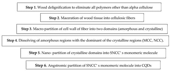 Schematic representation of deriving CQDs from macro-, nano-, and angstrom-structured cellulosic tissues.
