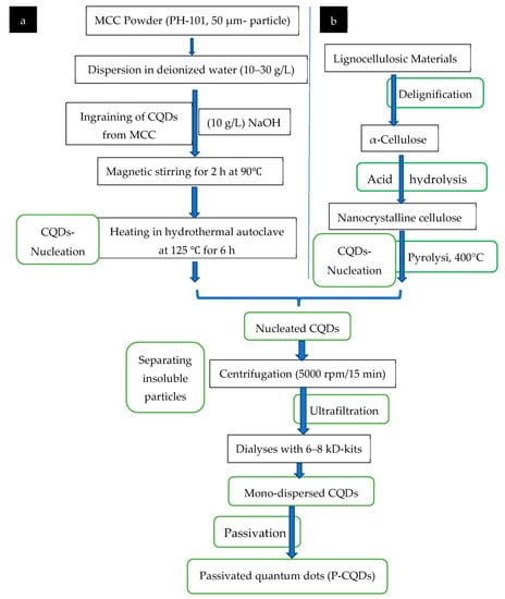 Synthesis of CQDs from (a) MCC, and (b) NCC [11,16].