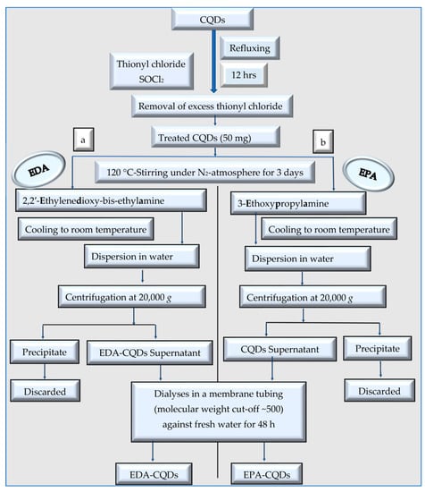 As shown in Figure 2 and Figure 8, the synthesized CQDs are chemically passivated to yield either EDA- or EPA-CQDs [40]. First, the CQDs are allowed to react with SOCl2 in order to form the acid chloride intermediates which are more active than their carboxylic group precursors, and form amides by a reaction with the amine-terminated molecules [15].