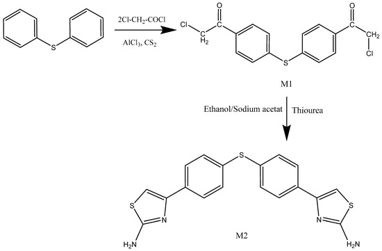 First, chloroacetyl chloride and diphenyl sulfide were reacted in dry carbon disulfide with the aid of aluminum chloride to produce 4-bis-chloroacetyl-diphenylsulfide (M1). After 6 h of refluxing M1 and thiourea in 100% ethanol, sodium acetate was added to the resulting reaction mixture to produce the monomer 4-bis-2-aminothiazole diphenyl sulfide (M2) (Figure 1). Melting point measurements were performed on the synthesized monomers, and the findings were found to be in accordance with the published literature [43,44]. Many spectroscopic investigations, including those employing Fourier transform infrared spectroscopy (FT-IR) and proton nuclear magnetic resonance (NMR) spectroscopy (1H- and 13C-NMR), were conducted to verify the hypothesized structures, as reported in the Experimental section and the Supplemental Information file.