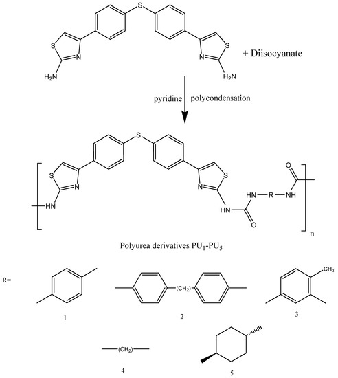Afterward, a new series of polyurea derivatives—PU1, PU2, PU3, PU4, and PU5—was synthesized using the solution polycondensation procedure through the interaction between M2 and different aromatic aliphatic and cyclic diisocyanates in pyridine, as presented in Figure 2. The synthesis of polyurea linear polymers is generally based on the condensation of diisocyanates with dicarboxylic acid chlorides in dry pyridine [30,31,32].