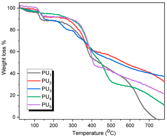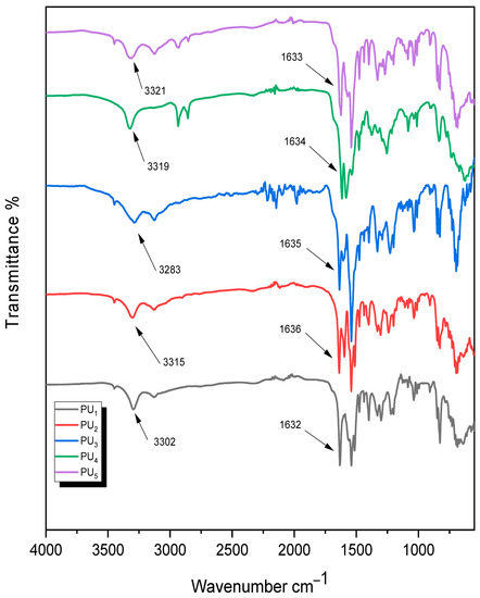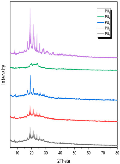 PU5 is the most crystalline of the PUs and can be categorized as a crystalline polymer due to its crystalline diffractogram. The X-ray diffractograms show a large number of reflection peaks that are intermediate between crystalline and amorphous interferences in the same region, indicating the presence of C=O and S as polar groups and high C=C bond levels in the polymers’ main chains, which induce a significant degree of order between the two adjacent chains of polymers, leading to a noticeable increase in crystallinity [43]. In addition, the presence of a high number of C=C bands and C=O bands, which represent polar groups arranged between the adjacent polyurea chains, could have caused this increased crystallinity [32].