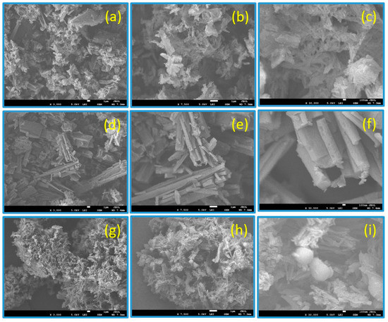 The morphological features of the new polyurea derivatives were studied via SEM measurements, as illustrated in Figure 6. PU1, PU4, and PU5 were employed as the measured samples, indicating that the surface of PU1 consisted of micro-holes, yielding spongy, porous shapes at different magnifications (x = 3000, 7500, and 30,000), as illustrated in Figure 6a–c, respectively. Meanwhile, PU4′s surface displayed shapes resembling wooden planks, sticks, or rod-like particles at magnifications of x = 3000 (Figure 6e) and 7500 (Figure 6e). The same features appeared at a magnification of x = 30,000 (Figure 6f). The average rod diameter ranged from 100 to 150 nm. Furthermore, the surface of PU5 showed coral-reef-like shapes with flowery shapes and noticeable round particles at lower and higher magnifications of x = 3000, 7500, and 30,000 (Figure 6d–f). Such globular particles were clearly visible when zooming in, as illustrated in Figure 6i.