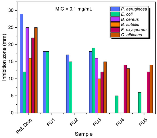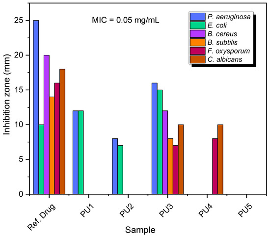 Biologically active polymers and/or their related nanocomposites are of significant interest to a huge number of researchers worldwide [55,56,57,58,59,60,61,62,63]. E. coli and P. aeruginosa were identified as representative Gram-negative bacteria and B. cereus and B. subtilis were chosen as representative Gram-positive bacteria for the purpose of the antimicrobial screening of all the synthetically produced polyurea derivatives (PU1–PU5). In order to evaluate the produced polymers’ antifungal properties, a number of different species of fungi, including F. oxysporum and C. albicans, were utilized. The inhibitory area was measured in millimeters, and the antibacterial and antifungal activities were evaluated in relation to the standard medications Ampicillin and Dermatin, which served as references for the antibacterial and antifungal activities, respectively.