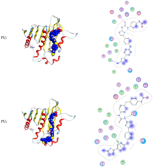 All polyurea derivatives (PU1–5) were screened for the presence of the 1KNZ protein of the Gram-negative bacteria E. coli. 1KZN codes for the 24 kDa gyrase fragment, which is the main protein involved in the replication and transcription of bacterial circular DNA [48,49]. Furthermore, the 1JIJ protein is contained in the Gram-positive bacteria S. aureus [50,51], and the 1IYL protein of C. albicans is commonly used as a model organism for fungal pathogens [64,65].