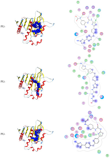 PU3 has the highest docking score of all the Gram-positive, Gram-negative, and fungal proteins among all other compounds, with docking scores of −9.97, −9.04, and −10.55 k.Cal, respectively (Table 5 and Table 6 and Table S2 (see Supporting Information file)). These results are in agreement with the obtained experimental results against the selected bacteria and fungi.