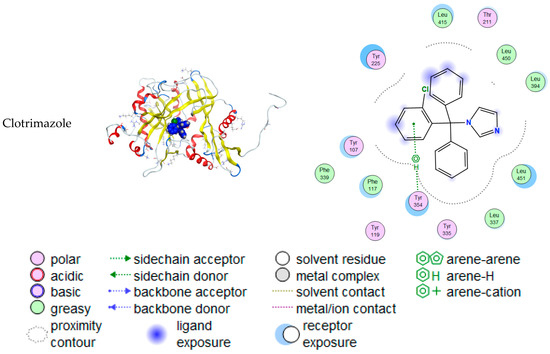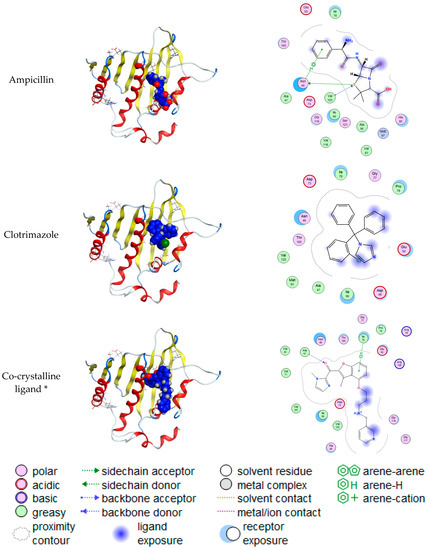 Molecular docking is a category of bioinformatics modeling that concerns inducing the interaction of two or more molecules to provide a stable adduct. Then, depending on the binding properties of ligand and target, it is used to predict three-dimensional structures of any degree of complexity. All molecular docking protocols were performed using the MOE 2019.0120 software by employing the triangle matcher method, and refinement was performed using rigid protein and flexible compounds. The docking score and RMSD were determined for the ten highest docking positions by London dG, and the five best scores were obtained. The crystal structures of 1KNZ, a protein of the Gram-negative bacteria E. coli; 1JIJ, a protein of the Gram-positive bacteria S. aureus; and 1IYL, a protein of C. albicans, whose sources are commonly used as model organisms for fungal pathogens, were downloaded from the Protein Data Bank “https://www.rcsb.org/” (accessed on 20 February 2023) [48,49,50,51]. All proteins were isolated and corrected after removing all solvent molecules and cocrystalline compounds. The active site for all proteins was chosen as the exact site of the downloaded structures. The validation of the docking protocol was performed by executing the protocol for a cocrystalline compound, whose RMSD was 1.93 Å (<3.00 Å).