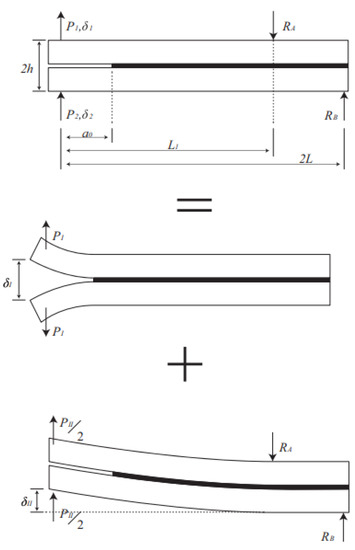 where E and G are the Young’s and shear moduli of the adhesive, respectively, and a is the crack length, B is the width of the joint, and h is the thickness of the specimen. L and L1 are defined in Figure 3. CBBM also considers the FPZ in the equivalent crack length (), which is possible to determine through the specimen’s compliance. For mode I, the formula is represented by Costa et al. [19]