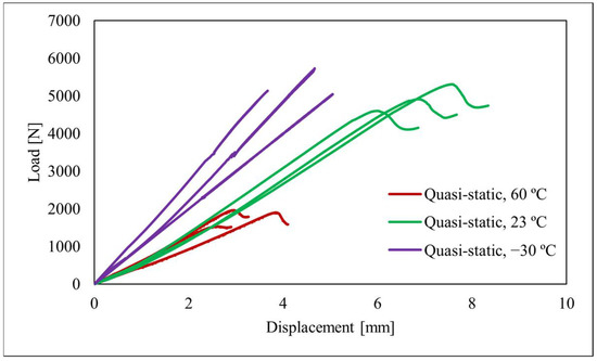 Figure 6 shows the maximum load for different loading rates and temperatures. There is a clear change in the adhesive response accordingly with the temperature and loading rate applied. By increasing the test speed from a quasi-static condition to a high strain rate, the adhesive itself was able to withstand more load for temperatures above its . This may be due to the fact that when the adhesive is at temperatures below its glass transition point, the adhesive becomes more brittle, with a more solid and rigid state. At this temperature, the adhesive is more likely to crack when submitted to stress/strain once it has less ability to dissipate energy through deformation. It is in this condition the adhesive is more sensitive to any types of defects/voids introduced during the manufacturing process.