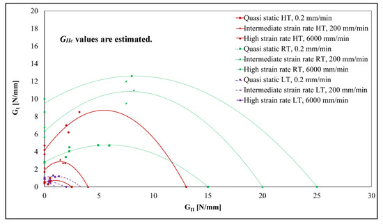 Figure 11 shows the fracture envelope for this adhesive. As can be seen in the figure, all the GIIc values have been estimated, because if a test were performed closer to pure mode II, with a mode-mixity higher than 45°, there would be a risk of plastic deformation of the substrate before crack propagation in the adhesive layer, especially under higher strain rate conditions at high and room temperature. The results of the quasi-static test at 23 °C, performed at a mixed-mode angle of 60 °C, were also taken into account to obtain the best possible approximation of the fracture envelope.