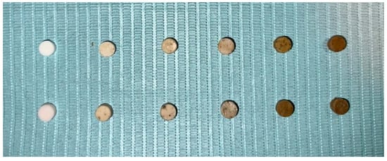 Disk-shaped study samples with 0%, 0.5%, 1.0%, 2.0%, 4.0% and 8.0% GA incorporated in GIC (from left to right). The top and bottom rows represent samples using Medicem and Ketac Cem Radiopaque, respectively.