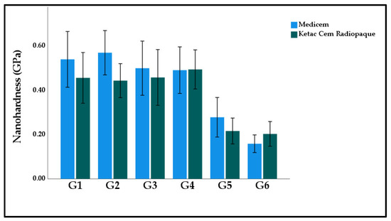 Bar graph illustrating the mean nano hardness of the experimental GICs modified with functionalized GA powder. Note: Significant differences were observed between G1:G5; G1:G6; G2:G5; G2:G6; G3:G5; G3:G6; G4:G5; G4:G6 in both Medicem and Ketac Cem Radiopaque.