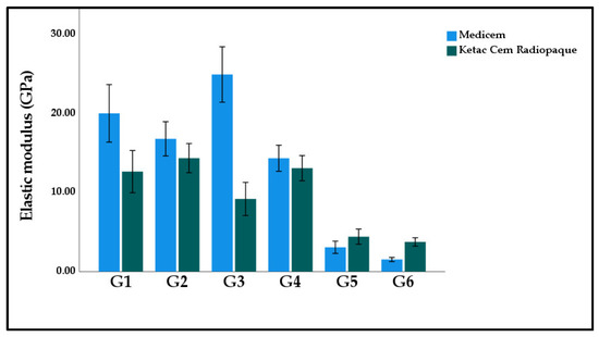 Bar graph illustrating the mean elastic modulus of the experimental GICs modified with functionalized GA powder. Note: Insignificant differences were observed between G1:G2; G2:G4; G5:G6 in Medicem while insignificant differences were observed between G1:G2; G1:G3; G1:G4; G2:G3; G2:G4; G5:G6 in Ketac Cem Radiopaque.