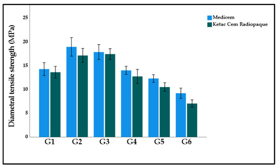 Bar graph illustrating the mean diametral tensile strength of the experimental GICs modified with functionalized GA powder. Note: Insignificant differences were observed between G1:G4; G1:G5; G2:G3; G4:G5 in Medicem while GI:G4; G2:G3; G4:G5 in Ketac Cem Radiopaque.