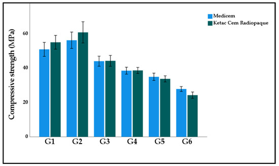 Bar graph illustrating the mean compressive strength of the experimental GICs modified with functionalized GA powder. Note: Insignificant differences were observed between G1:G2; G3:G4; and G4:G5 in both Medicem and Ketac Cem Radiopaque.